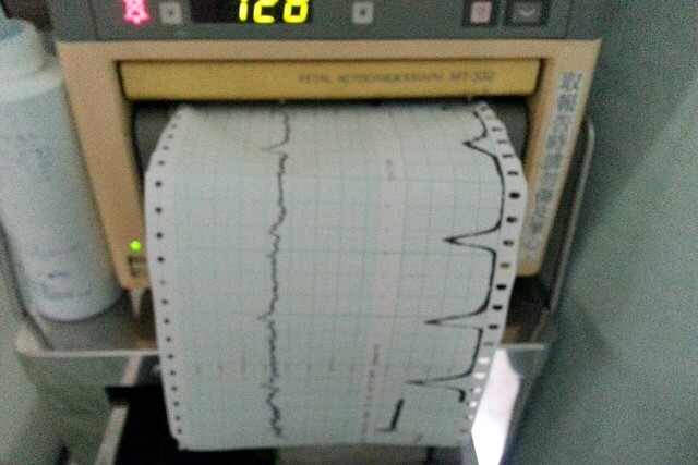 5點半的時候,再度內診…9公分…不過!這時候綁在肚子上的胎音突然變得很慢,我聽了都覺得心裡很慌,連忙問醫生:「胎音怎麼突然變那麼慢????」醫生說:「應該是小寶寶的頭卡在骨盆腔下不來…」