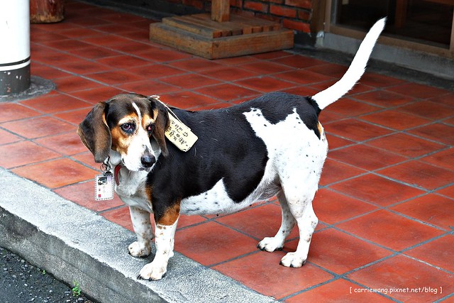 門口這隻狗狗好可愛,它身上的牌子寫:減肥中,不要餵食我…