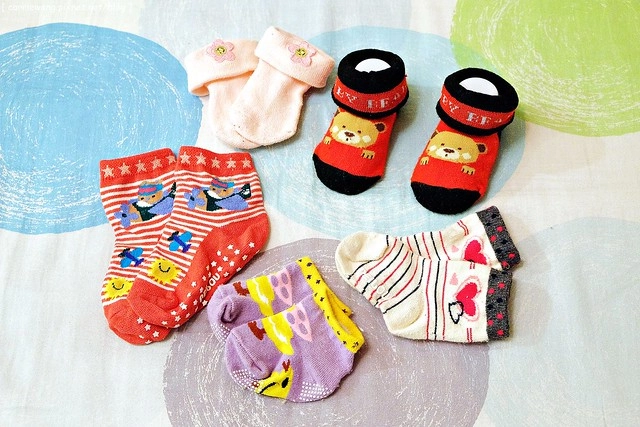 襪子也是為了保暖,如果搭配蝴蝶裝的時候,建議襪子可以買長統的,小腿才不會露出來…(我後來才知道嬰兒的襪子真的也有長統的耶!)