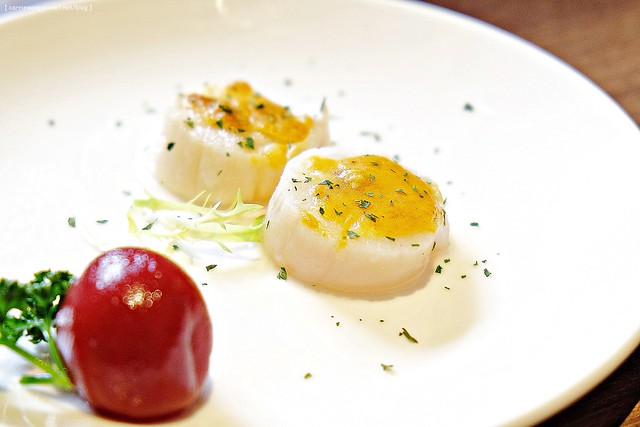 一旁盤飾的漬番茄不是放好看的哦!是真的可以吃,吃起來酒香氣很明顯,我吃了很多顆,真的很多顆,真的很多顆…XD