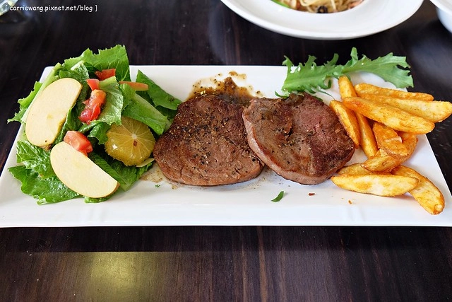 嫩煎菲力牛排附帶皮馬鈴薯 – $580元,這份就是聖誕大餐來著,有牛排、沙拉和薯條…