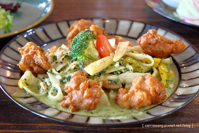 灣式麵/九層塔唐揚雞 – $240元,這一道使用的麵條是台灣寬板麵,但是以義大利麵的料理方式呈現…