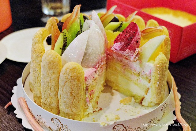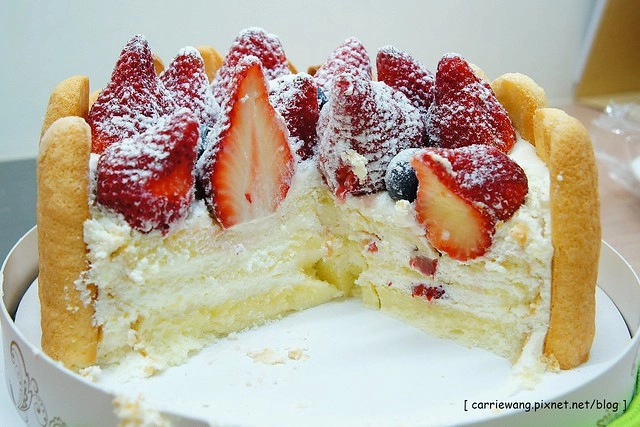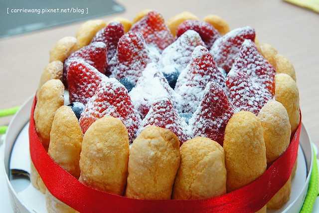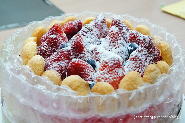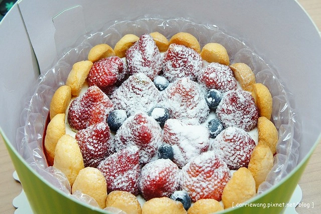 外圍有一圈手指餅乾,然後再用緞帶綑起來,上頭是滿滿的草莓和藍莓,再灑上一層糖粉…光看外表就覺得非常的漂亮吸睛…