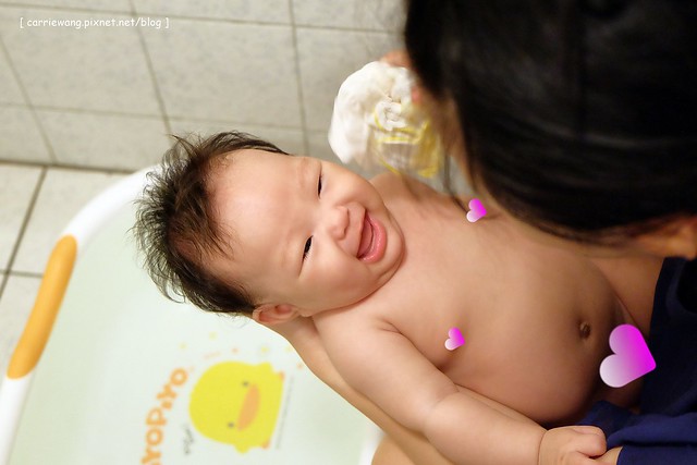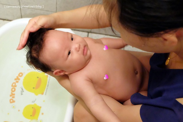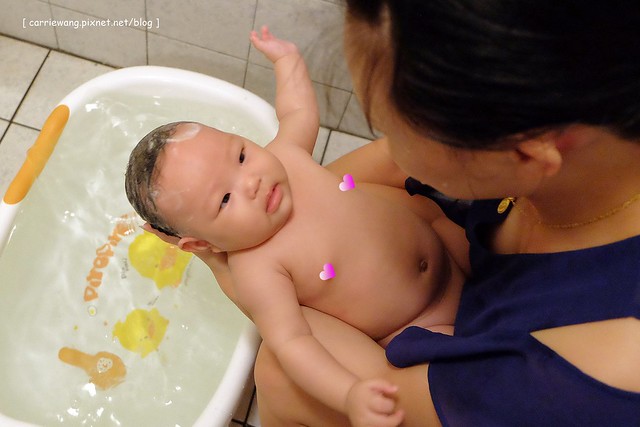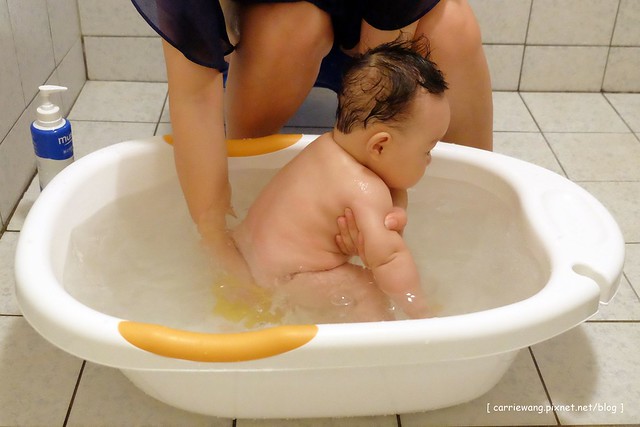 小櫻桃在醫院期間,是由醫院的護士幫忙洗澡,進了月子中心後就變成護理人員幫忙洗澡,回到娘家坐月子後,原本是璇媽幫忙洗澡的,但是璇媽畢竟年紀有了,而且少說有30年沒幫新生兒洗過澡了,所以動作有些卡卡的,所以隔天起就由璇自已動手幫小櫻桃洗…