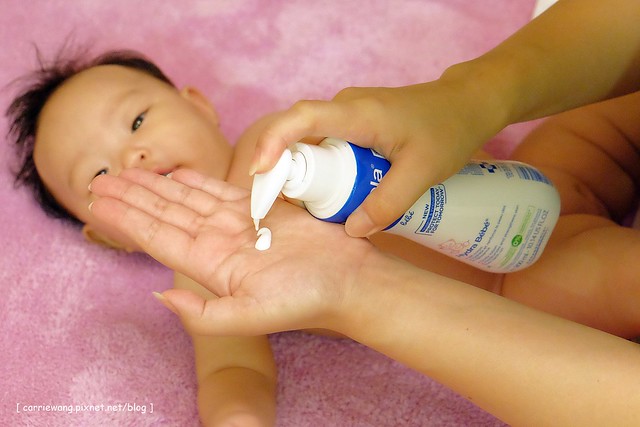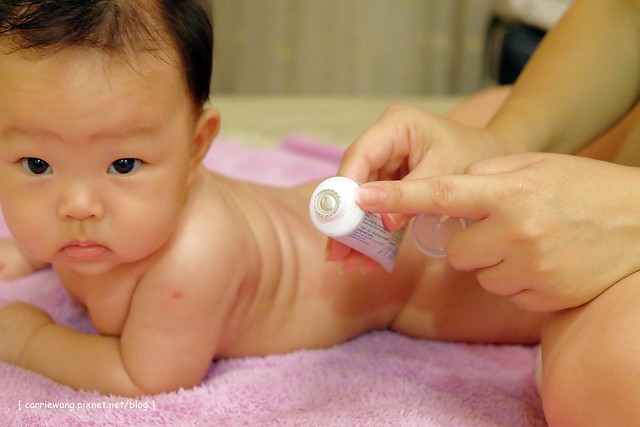 我們會在幫小櫻桃擦乾身體後立即塗抹乳液,再幫她按摩…而且如果發現皮膚有比較乾的現象我們就會再補充擦拭,以幫助她的肌膚隨時處於保濕狀態…