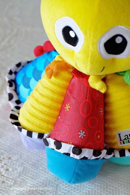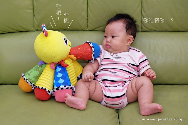 2個月左右的,我開始試著把”音樂布蟲尺”放在小櫻桃的身上,這個時候她已經會好奇的抓過來把玩了…