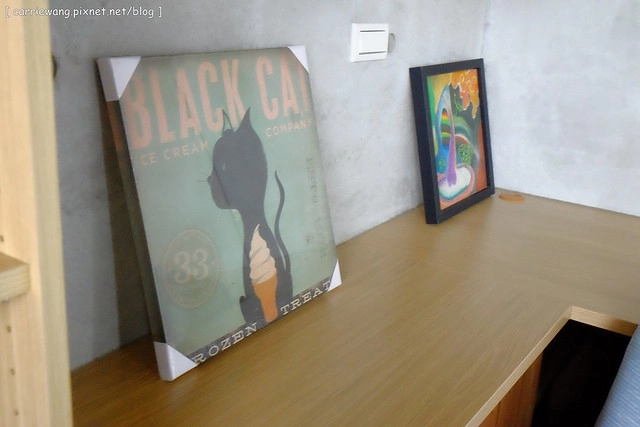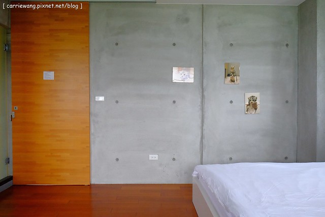 以清水模為建築特色,就連牆也是如此簡單,牆上只貼著幾張愛醬的照片…