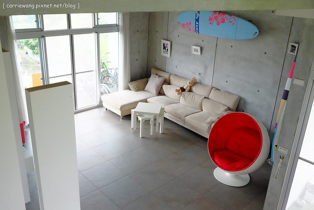 客廳佈置的很簡單但是充滿活動,尤其旁邊的沖浪板將屋子注入一股很年輕的活力…