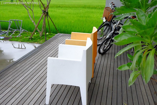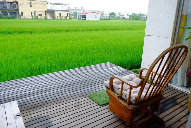 坐在躺椅上,映入眼簾的是一片綠油油的稻田,真是太棒的美景了…