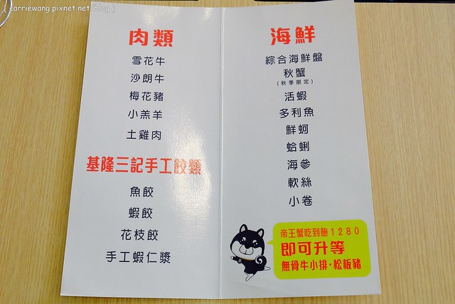其他還有肉類、餃類和海鮮類…一般吃到飽的話,這些都可以點…如果是帝王蟹吃到飽的話,則又多了無骨牛小排和松板豬…