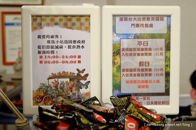 為了因應政府提倡的節能減碳,所以熱水不是全天候供應的哦!晚上6:00開始才有熱水,一直提供到晚上12:00,然後因為山上氣溫比較低的關係,所以早上6:00~8:00時段也有熱水供應…