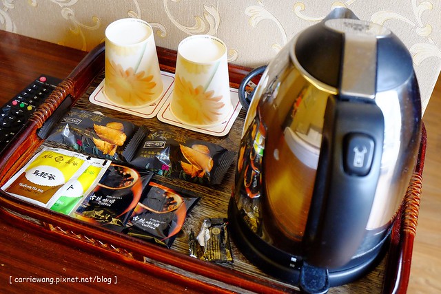 有熱水壺,還有茶包、咖啡和餅乾,這個冬筍餅可是竹山的特產呢!
