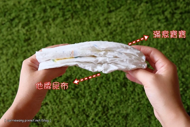分別用手指觸摸,上圖《滿意寶寶》紙尿褲很乾爽透氣,下圖他牌尿布則是覺得溼度明顯了一點…