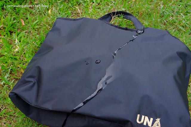 因為是使用防潑水尼龍布材質,包包不會溼…所以下雨天也不用擔心,加分!【育兒日記分享】Una超輕量媽媽包+Una收納包中包。貼心分隔、超大容量、材質輕盈、防潑水,媽媽出門的好幫手 @飛天璇的口袋