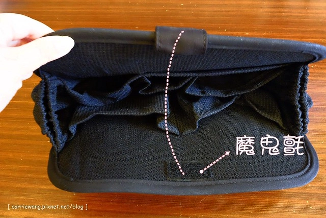 上面有一個提帶,可以把它粘在魔鬼氈上,拿取方便,而且也可以防止物品掉出…