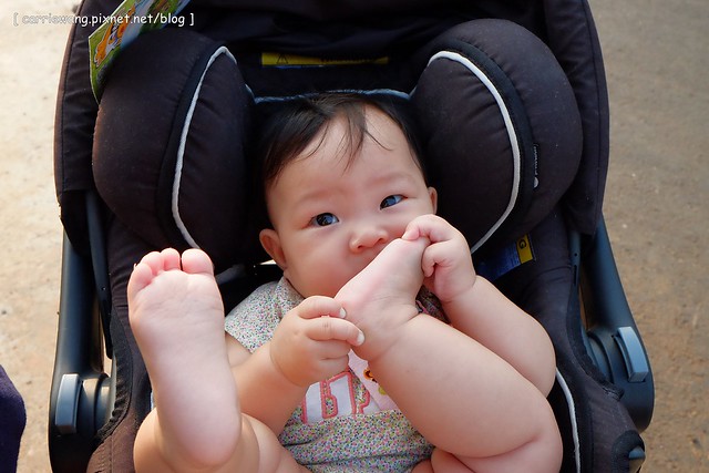 凱文說要帶小櫻桃到外面散散步,還叫我幫他們父女拍合照,但是人家小櫻桃明明不理他,她只對自已的腳有興趣…