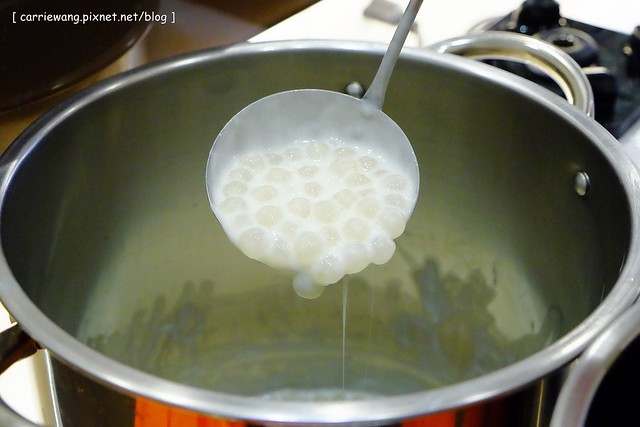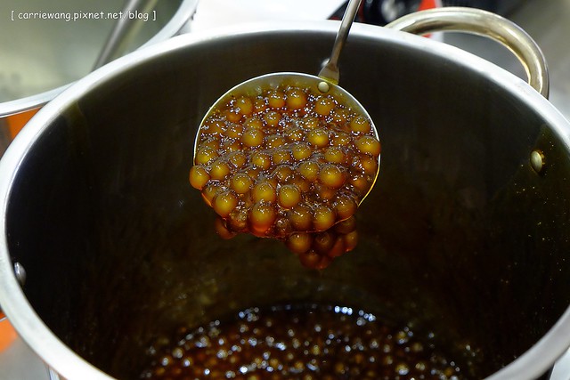 白玉珍珠是用太妃糖熬煮,標榜不另外添加色素,單就味道來說,焦糖珍珠的香氣來的比較明顯一點,但是又沒有市售珍珠的香氣那麼濃郁…