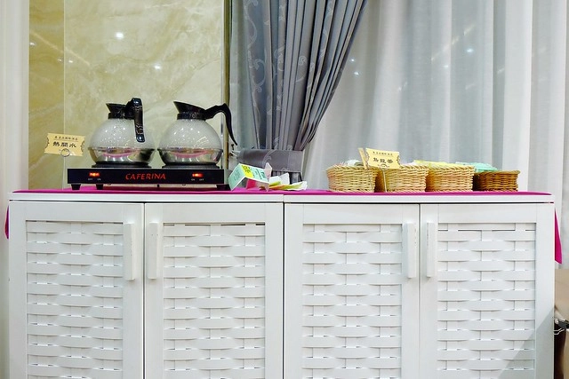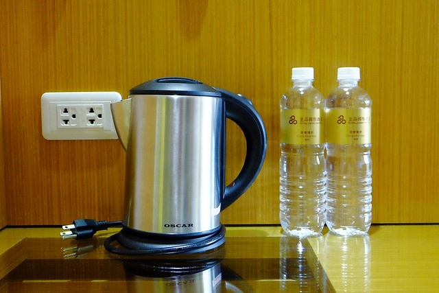櫃子上有熱水瓶和兩罐礦泉水…