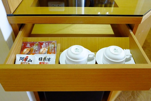 抽屜裡有茶包、咖啡包和杯子…