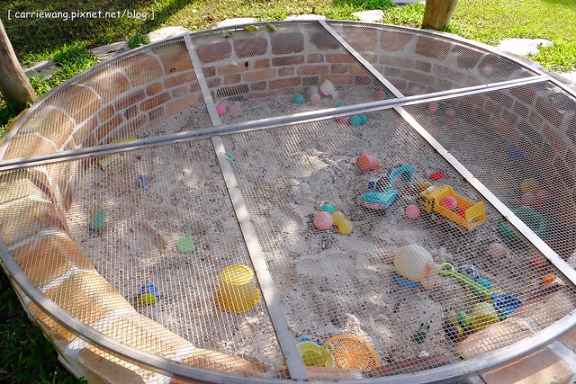 戶外也有兒童遊戲沙坑,平常會用網子蓋起來,要使用的時候再拿開…