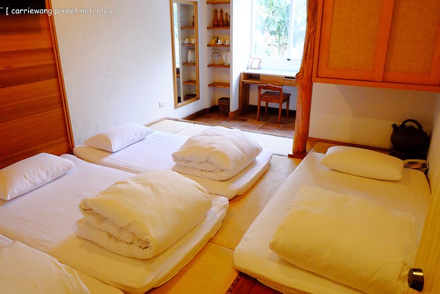 這間是一樓的三人房,等我們拍完照之後,拉拉就幫我們併床了,所以這天把棉被放床緣之後,小櫻桃也是有滾得很開心啦!