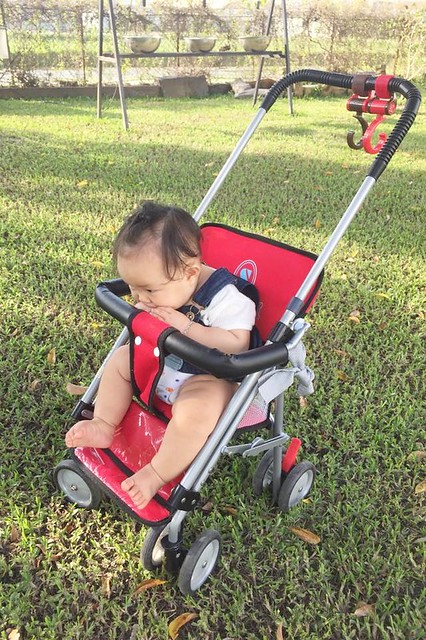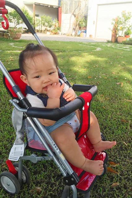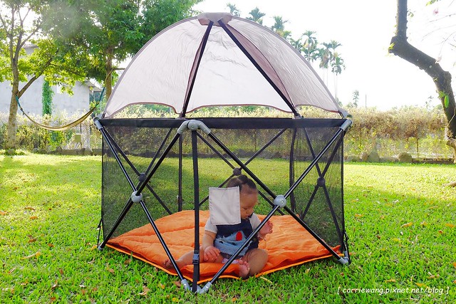 這天還順便帶著五角遊戲床出門,爸媽如果暫離或者忙碌的時候,可以把她丟在裡面,才不會亂爬亂拿東西咬…