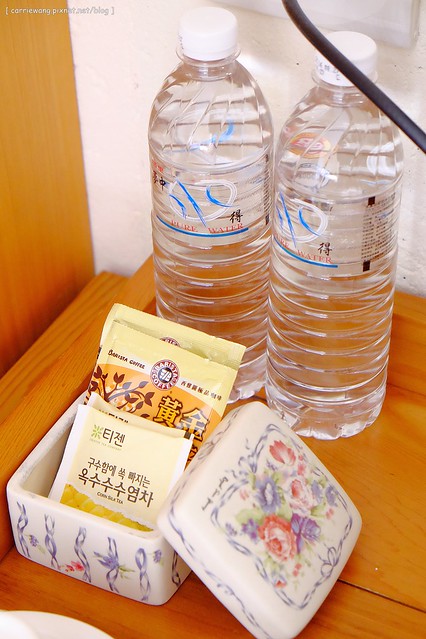 每間房間都有附礦泉水和三合一咖啡…比較特別的是~居然還有韓國進口的玉米鬢茶包!