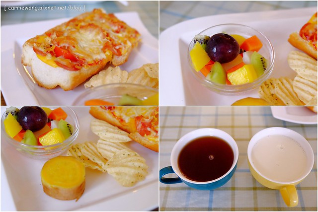 這是我們的早餐,其實還滿簡單的,不過吃的很飽…最主要是~我覺得東西都很天然養生,我甚至直接拿地瓜和水果來餵小櫻桃吃呢!