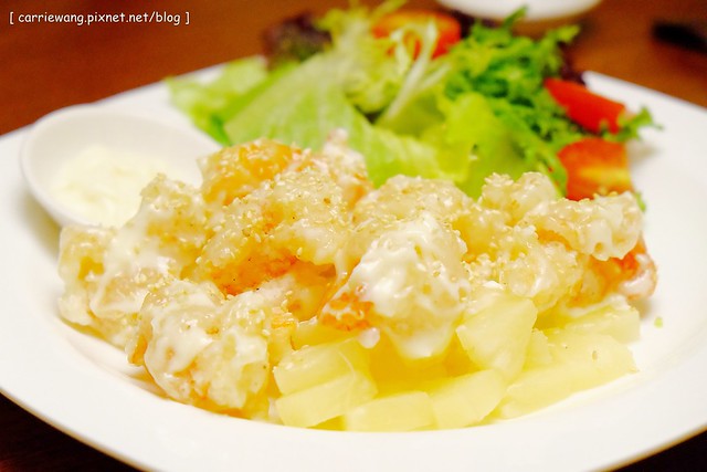 沙拉明蝦球 – $420元,蝦球的麵衣裏得不會太厚,外皮酥酥脆脆的,蝦肉紮實有彈性,搭配著鳳梨一起吃,酸甜又爽口…