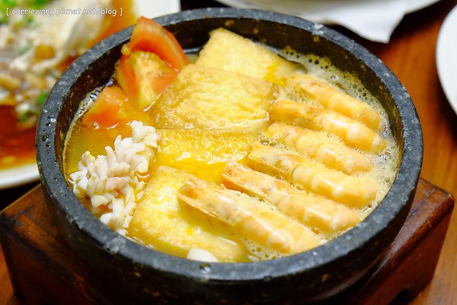 海鮮豆腐鍋 – $240元,使用的是雞蛋豆腐,已經吸附飽滿的湯汁了,口感很滑溜…裡面還有6隻個頭不算小的蝦子,每隻都是紮紮實實的,很有誠意…