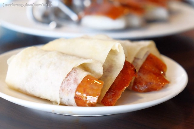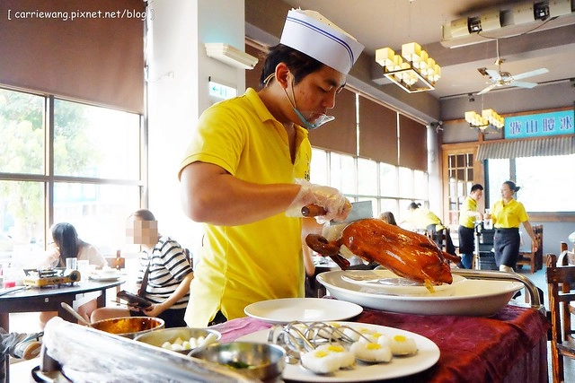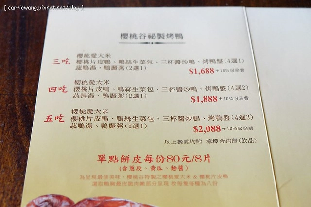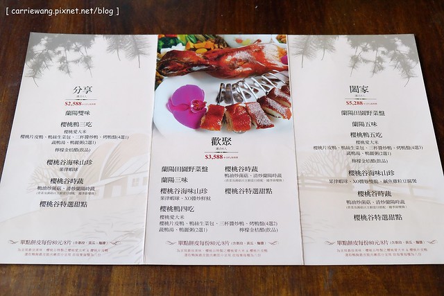 上回到宜蘭旅遊的時候,凱文說很想吃烤鴨,所以我叫他自已打電話到蘭城晶英酒店的《紅樓》訂位,沒想到假日不接受單點,我們兩個再怎麼會吃也消化不完一整桌的桌菜,所以只好打退堂鼓,結果民宿主人聽到之後,推薦了這間《礁溪庄櫻桃谷》,說是兩個人也可以點餐…