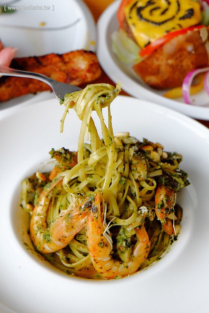 羅勒汁鮮蝦麵 – $270元,我這天才知道原來他們家也有賣義大利麵耶!我一直以為只有賣輕食說…