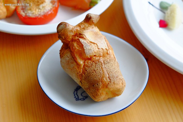 Popover…這是店家自製的手工麵包,看起來造型很特別吧?有點像蝸牛吧?它的外皮酥酥脆脆的,有點像法國長棍的口感,裡面雞蛋香比較明顯,撇開口感不說,香氣還滿像雞蛋糕的說!