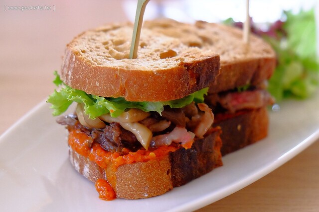 牛肉蘑菇三明治 – $270元,麵包的部份口感偏酥脆,內餡是蘑菇、牛肉、生菜和莎莎醬…整體吃起來很有層次感,而且牛肉淹漬有入味,口感也很嫩…