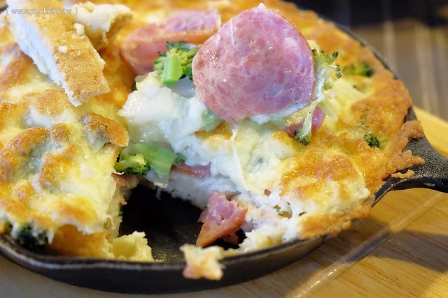 底層的麵包有點像吐司的口感,內餡有火腿、花椰菜、起司…
