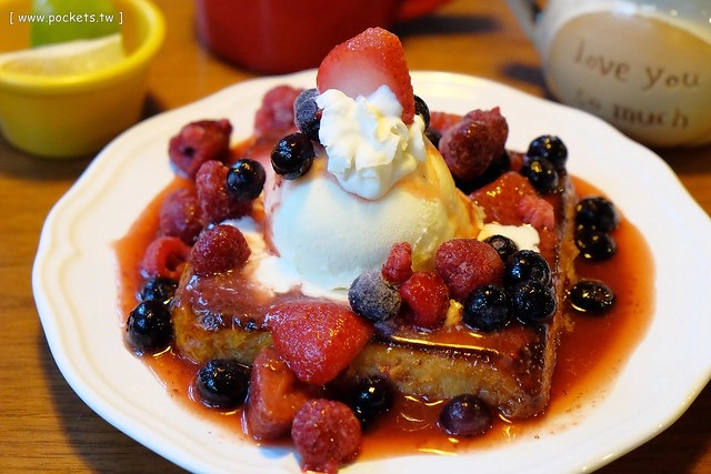 吐司烤的外層酥酥的,裡面軟軟的,剛烤出來的吐司伴隨著冰淇淋一起入口有冷熱交融的感覺,冰淇淋的甜中和了莓類的酸…