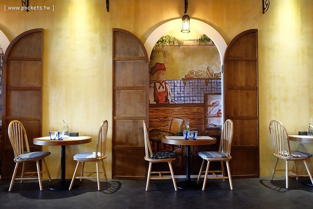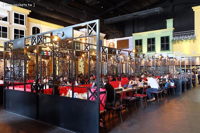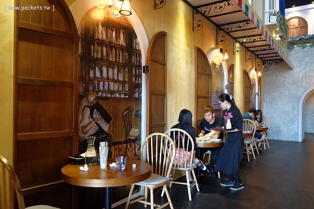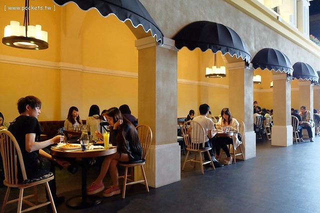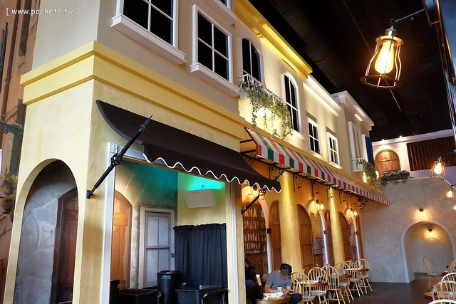 兩旁的用餐區則是以歐洲街頭為計設主軸,營造出一種庸懶舒服的氛圍,桌距也很寬敞,環境很大器也很有質感…