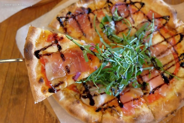 主要配料是蘑菇、起司、帕瑪森火腿再加上些許的巴薩米克醋和大量的芝麻葉…