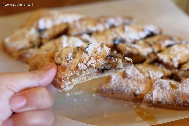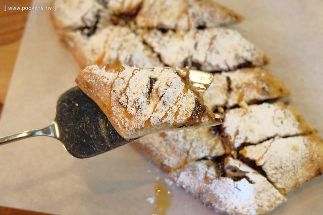 上面搭配的糖霜和榛果醬有畫龍點睛的效果,增加了披薩的香氣卻不會甜膩,餅皮愈咀嚼香氣愈明顯,好吃順口…我覺得它其實根本不是披薩,它是甜點來著呀!