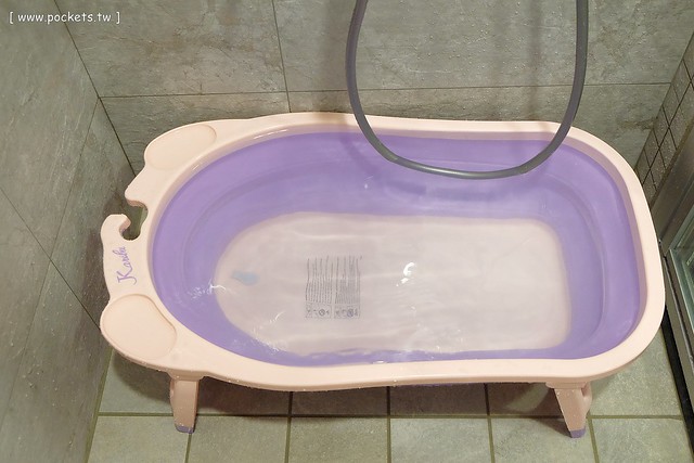 這個澡盆很特別唷!因為它可以折疊,凱文邊看邊覺得很神奇,早知道我們家也買這個好,收納方便…