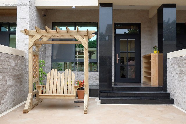 院子裡有一個盪千秋耶!可惜我們一家三口老的老、小的小,都不是適合玩千秋的年紀了…