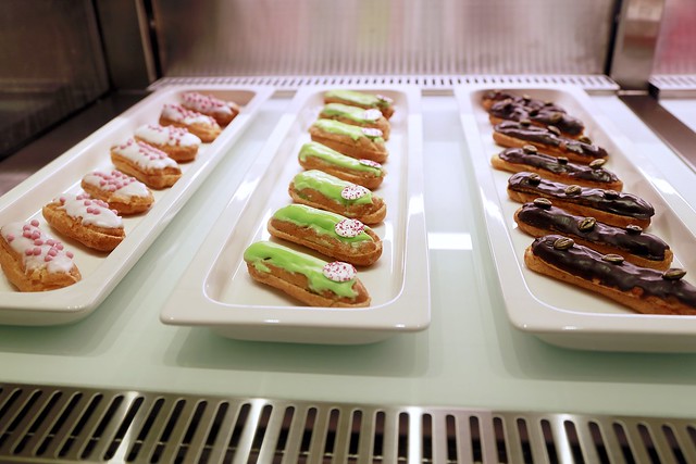 甜點的種類很多,放在美麗的玻璃櫃上,看起來很就像美麗的珠寶盒一樣,非常的精緻…