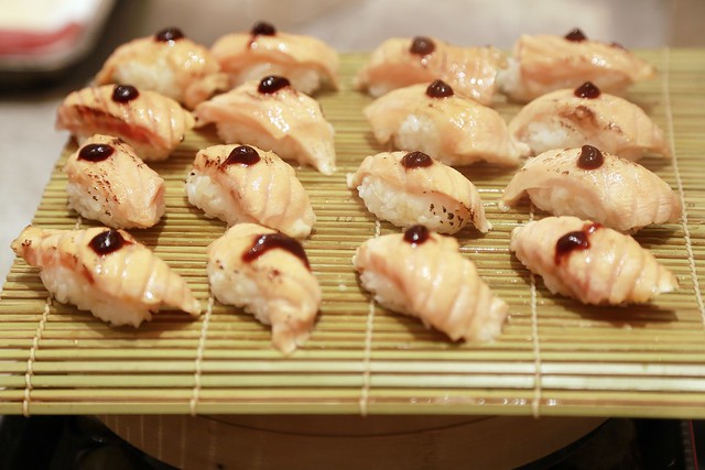 溫壽司將飯的溫度保持在37度,讓壽司入口後呈現微暖、溼潤還有入口即化的口感,這個也是師傅現場料理炙燒的…