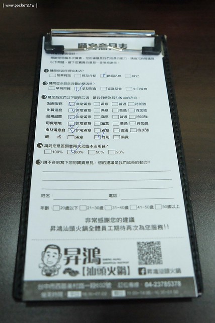 吃完火鍋記得要寫測驗卷…哈哈哈…沒啦!是寫意見調查表啦!老闆長的還滿年輕有為的,不然把妳的電話號碼寫上面也可以啦!XD