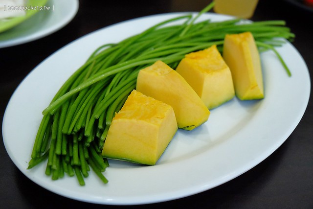 菜盤…全部都是蔬菜類,有南瓜、地瓜、木耳、鴻禧菇、芋頭、青花椰…配色上還不錯,有五行的效果…