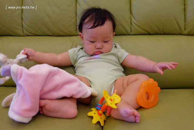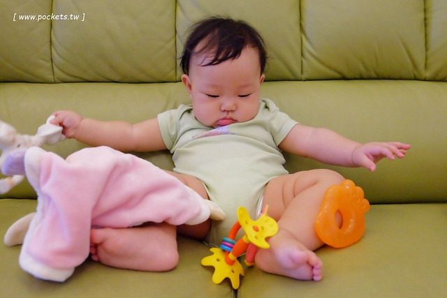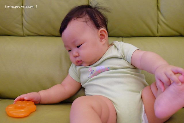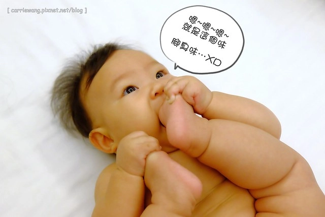 其實滿五個月開始,她最愛的還是她的腳,即使到現在軟Q度沒有以前那麼好了,逮到機會她還是試圖要吃腳…XD