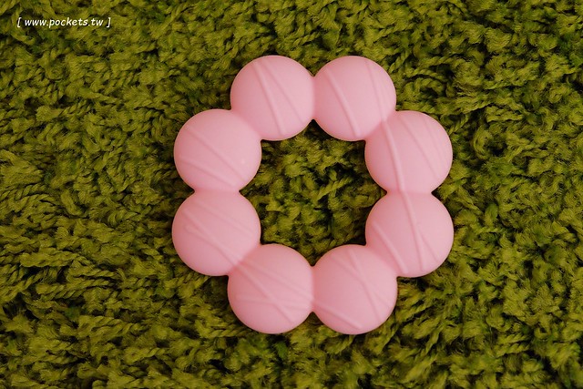 甜甜圈也是小櫻桃某一個時期的最愛,因為它的重量比上面的貝親小花重了一點,當寶寶在練習”握”的時候,小肌力需要用力,這個時候拿著甜甜圈會比拿貝親小花讓他們覺得有實在感和成就感…