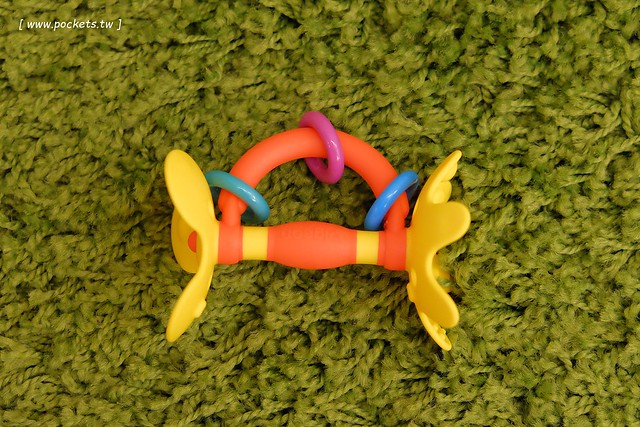 這一款算是綠色小花的二代,外型顏色更為鮮艷也更為花俏,而且還有三個小扣環,寶寶拿著的時候會發出小小聲”叮叮”的聲音,她會對這個聲音感到很好奇唷!