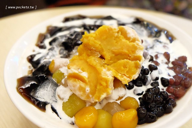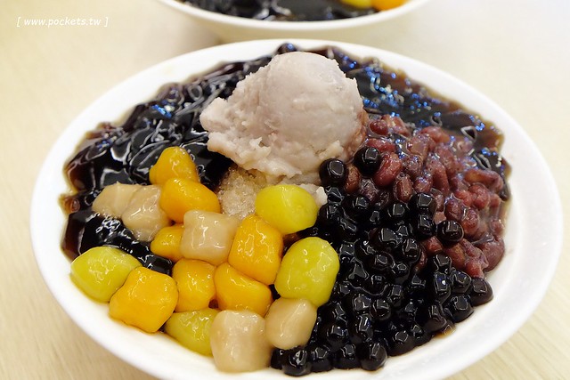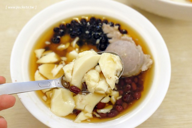 招牌雙芋豆花 – $55元,這碗裡面有芋泥、芋圓、珍珠和紅豆…老闆是特地讓我拍完照之後才淋上糖水的哦!