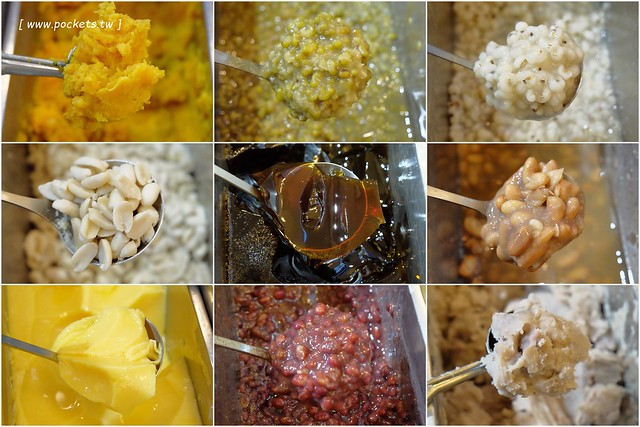 櫃子裡面放的都是配料,除了常見的紅豆、綠豆和花生之外,還有布丁和仙草…然後芋頭和地瓜是他們家的招牌,建議必點哦!